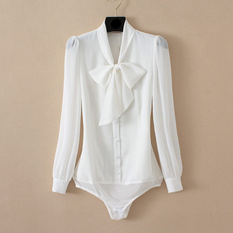 Elegant Chiffon Bodysuits Women Lantern Long Sleeve Bow Tie Neck Office Work Lady Tops and Blouses Female Formal Body Shirt