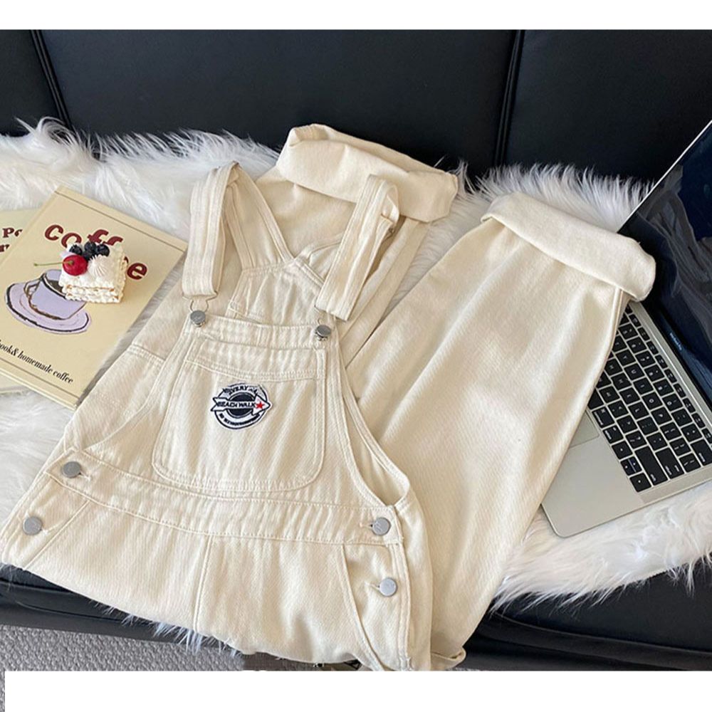 Embroidery White Denim Overalls Women Straps Pants High Waist Wide Leg Pants Casual Loose Female Jumpsuit Jeans New