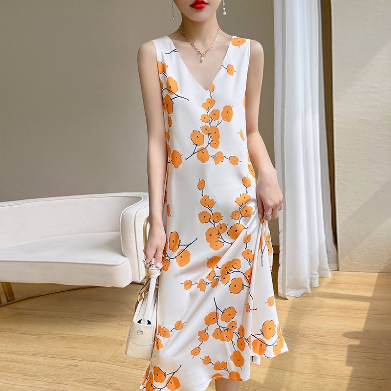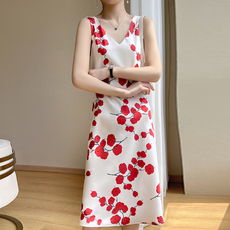 Explosive French Acetate Sling Dress Women's Summer Waist Long Skirt High-End Printed Skirt Suit Matching