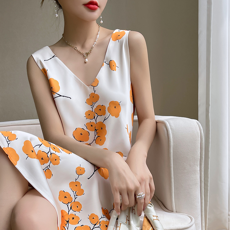 Explosive French Acetate Sling Dress Women's Summer Waist Long Skirt High-End Printed Skirt Suit Matching