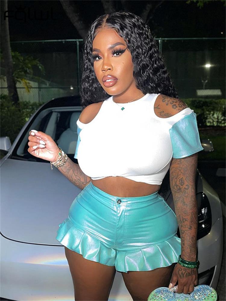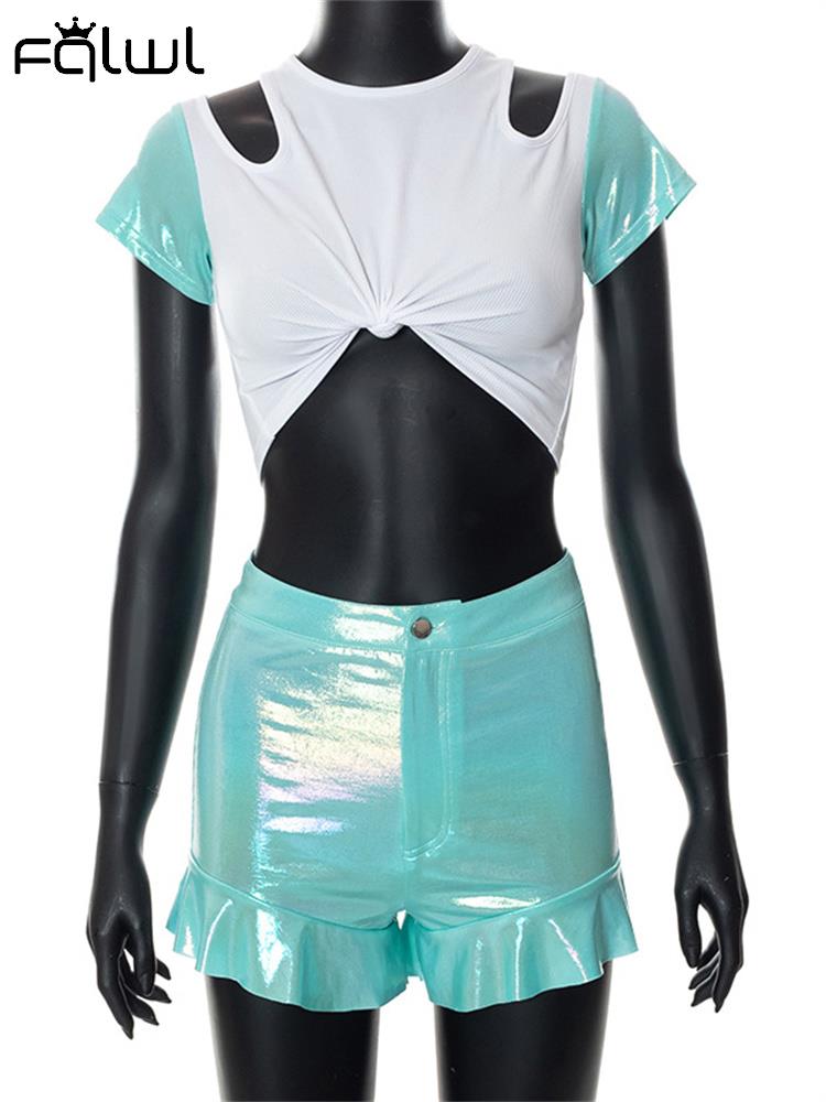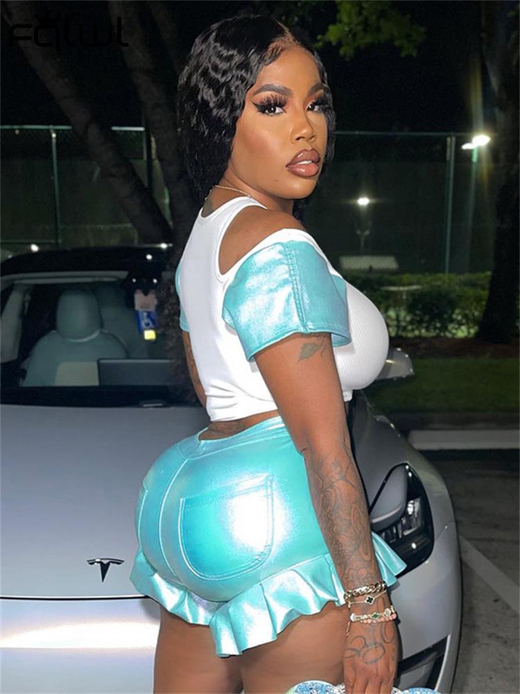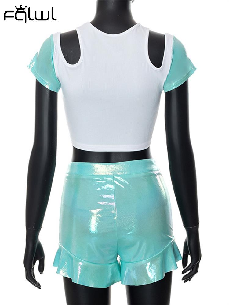 FQLWL Summer Casual 2 Two Piece Set Outfits Women Short Sleeve Bodycon Crop Top Skinny Ruffers Shorts Pink Matching Sets