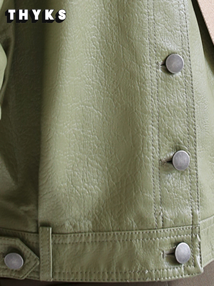 Fall Green Soft Faux Leather Jacket Ladies Pocket Loose Biker Cropped Jacket High Designer Clothing
