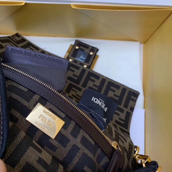 Large, iconic Baguette bag with flap and magnetic clasp. Lining with zip pocket. Can be carried by hand or worn cross-body thanks to the handle and shoulder strap, both detachable. Made of fabric with jacquard FF motif. Finished with edge in black satin stitch embroidery. Customized shoulder strap with Fendi Label motif in the same tones. Gold-finish metalware.