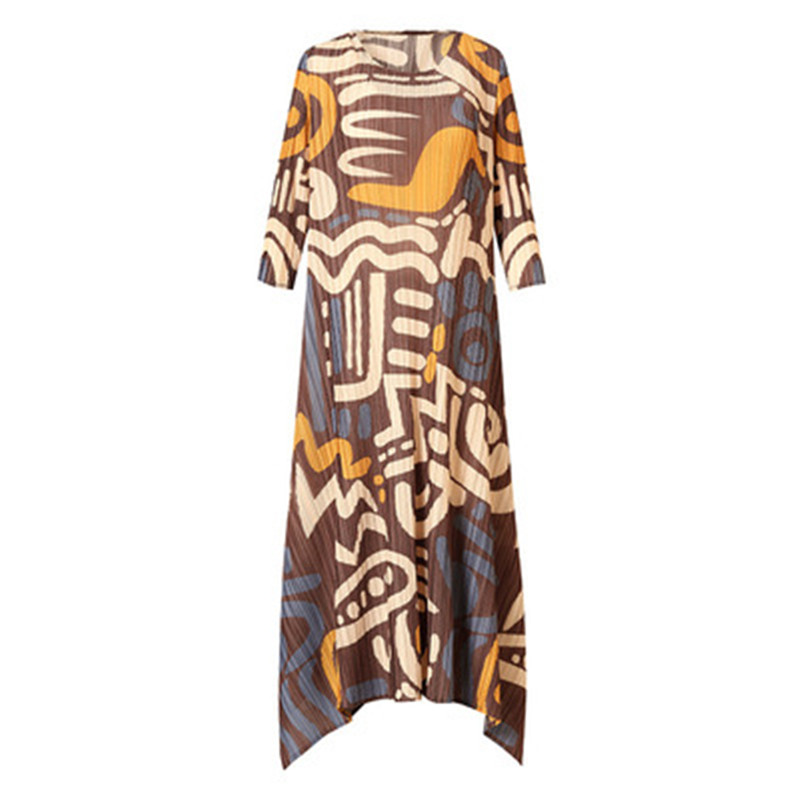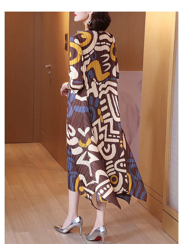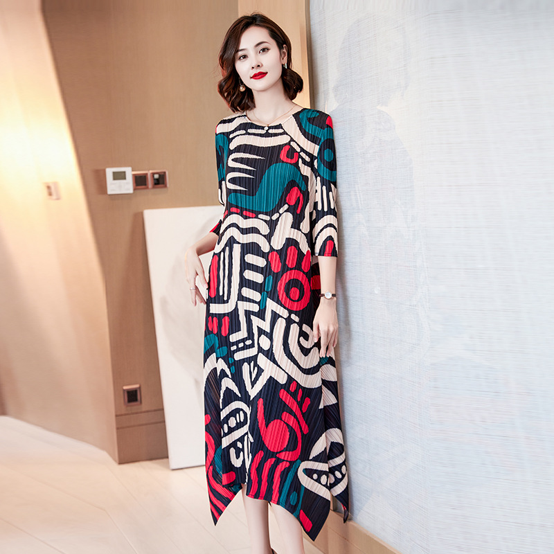 French printed dress autumn Miyake folds temperament loose large size women's dress was thin mid-length dress clothing