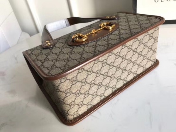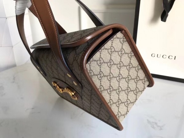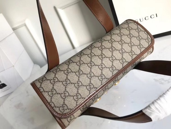 The top handle Boston bag is introduced within the Gucci Horsebit 1955 collection for Pre-Fall 2020 in the House’s GG monogram trimmed with brown leather. Inspired by archival designs, the line unifies the original details first introduced over six decades ago with a modern spirit, highlighting the Horsebit. Part of Gucci’s genetic code, the double ring and bar design has been established as one of the most distinctive elements among the House symbols borrowed from the equestrian world.