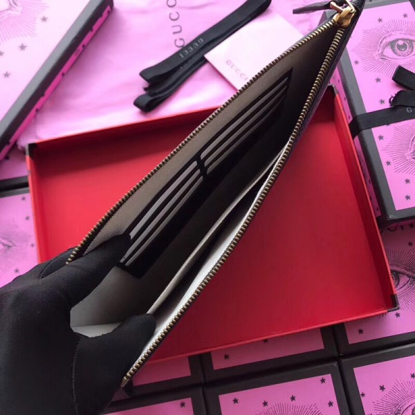 The Gucci bee—a historical symbol from the ’70s archives—is combined with the star motif. The print appears in metallic gold printed against black leather in the slim pouch.