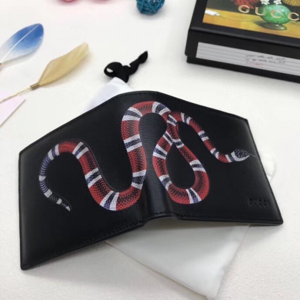 The Kingsnake, thought to symbolize wisdom and power, emerges as one of the signature details of Alessandro Michele’s collections. Here, it is printed across a bi-fold wallet made in black leather.