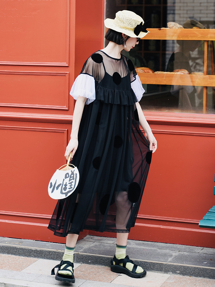 Imakokoni Original Summer polka dot patchwork gauze skirt Dress with loose bubble sleeves for Women 223771
