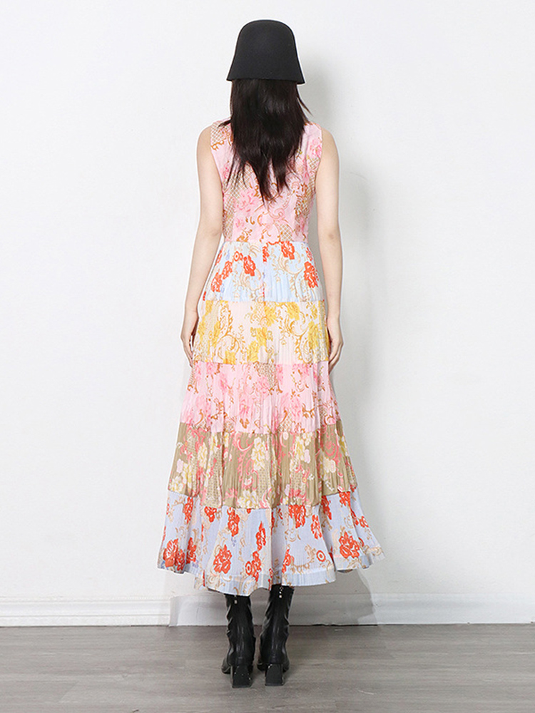 JUNLINNA Summer Women Bohemian Dresses Sexy V Neck Sleeveless Printed Rufflies Party Holiday Long Vestidos Waist-closing