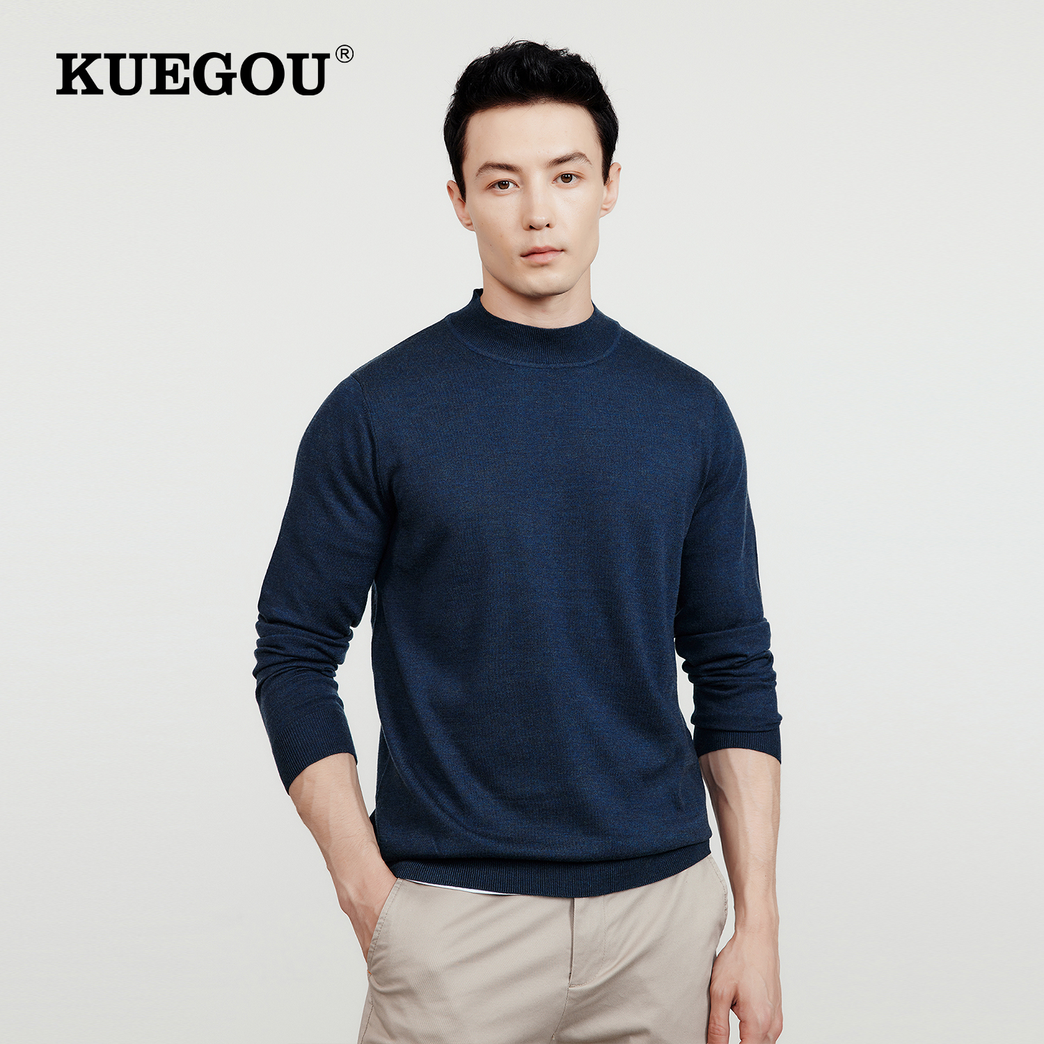 KUEGOU Autumn Men Sweater Solid color Semi-high Collar High Slim Male Soft Knitted Blends Wool Warm 710