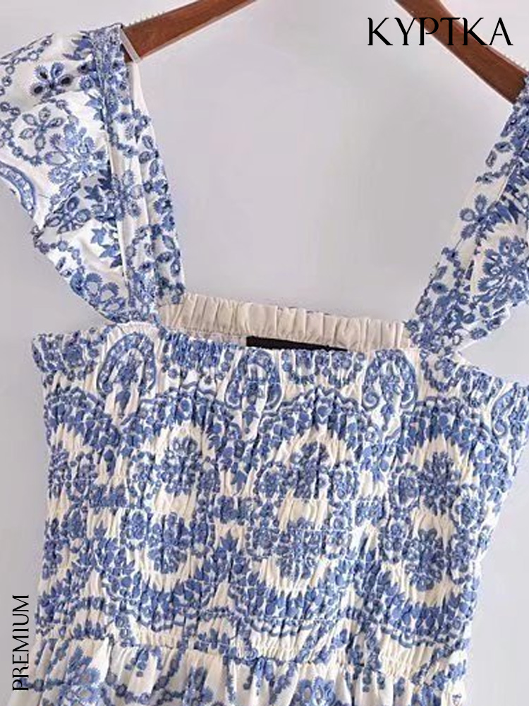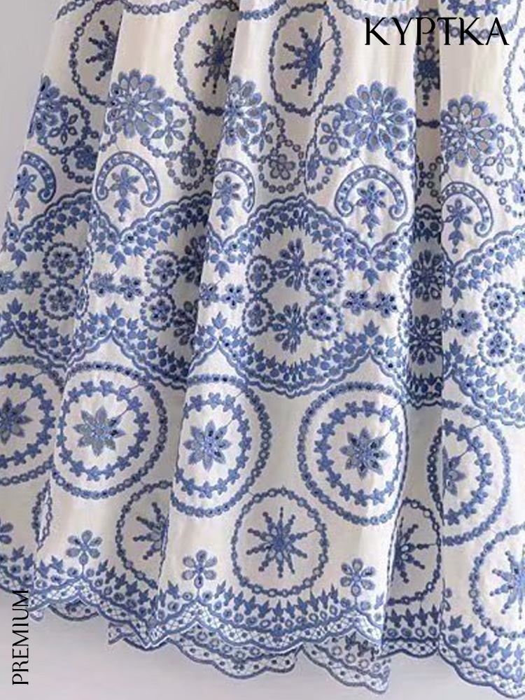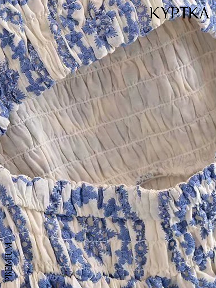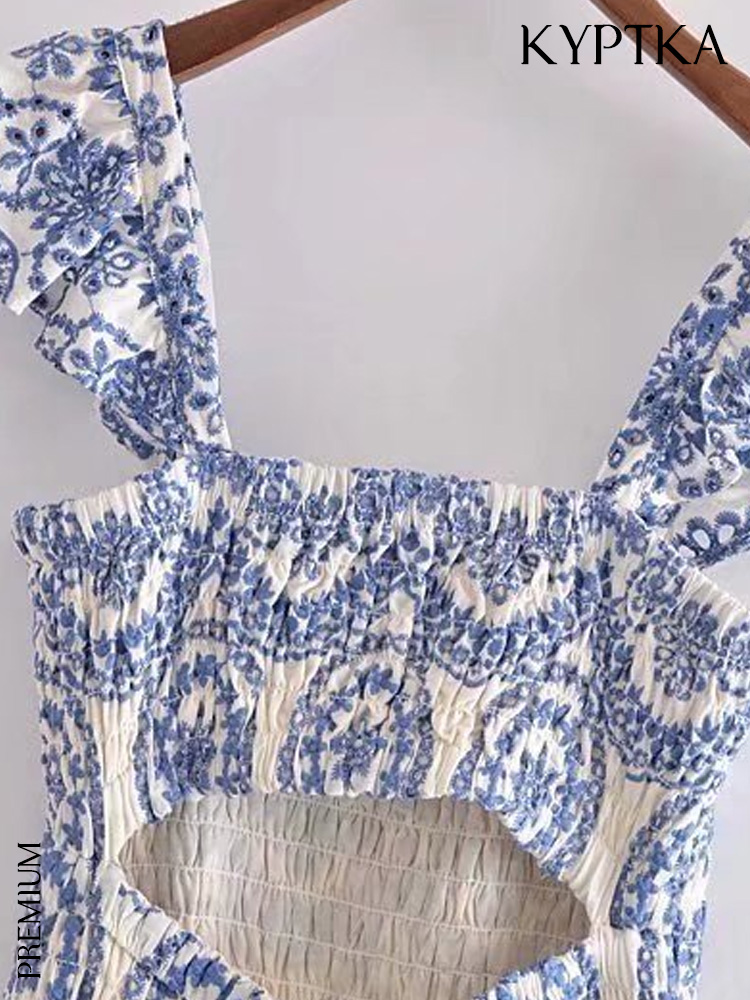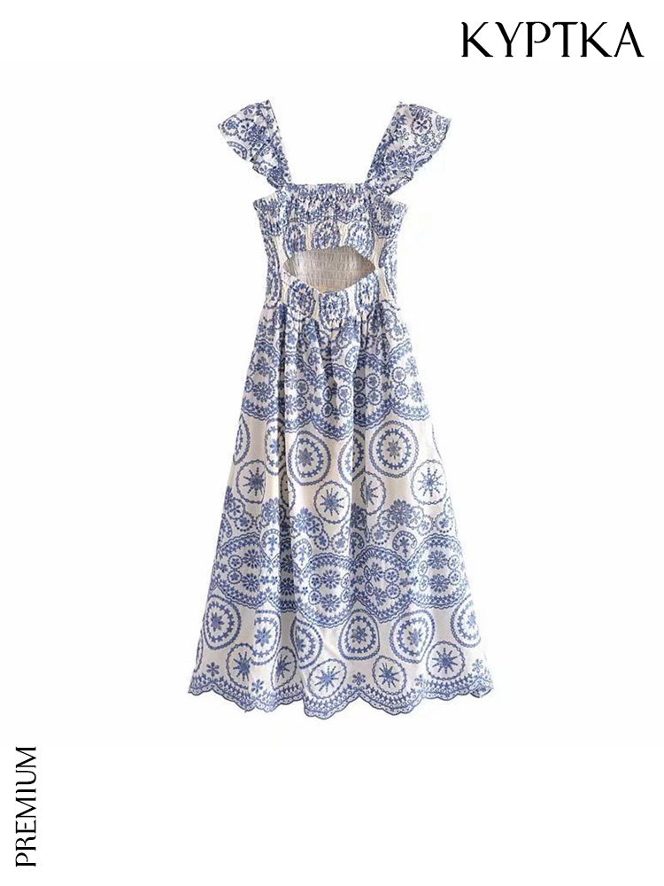 KYPTKA Women Cutwork Embroidery Smocked Midi Dress Vintage Backless Ruffled Straps Female Dresses Vestidos Mujer
