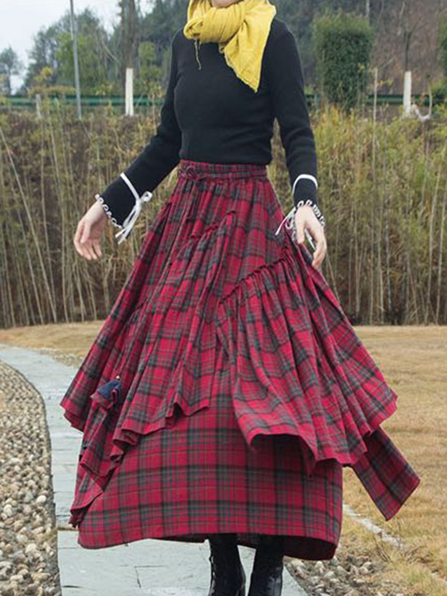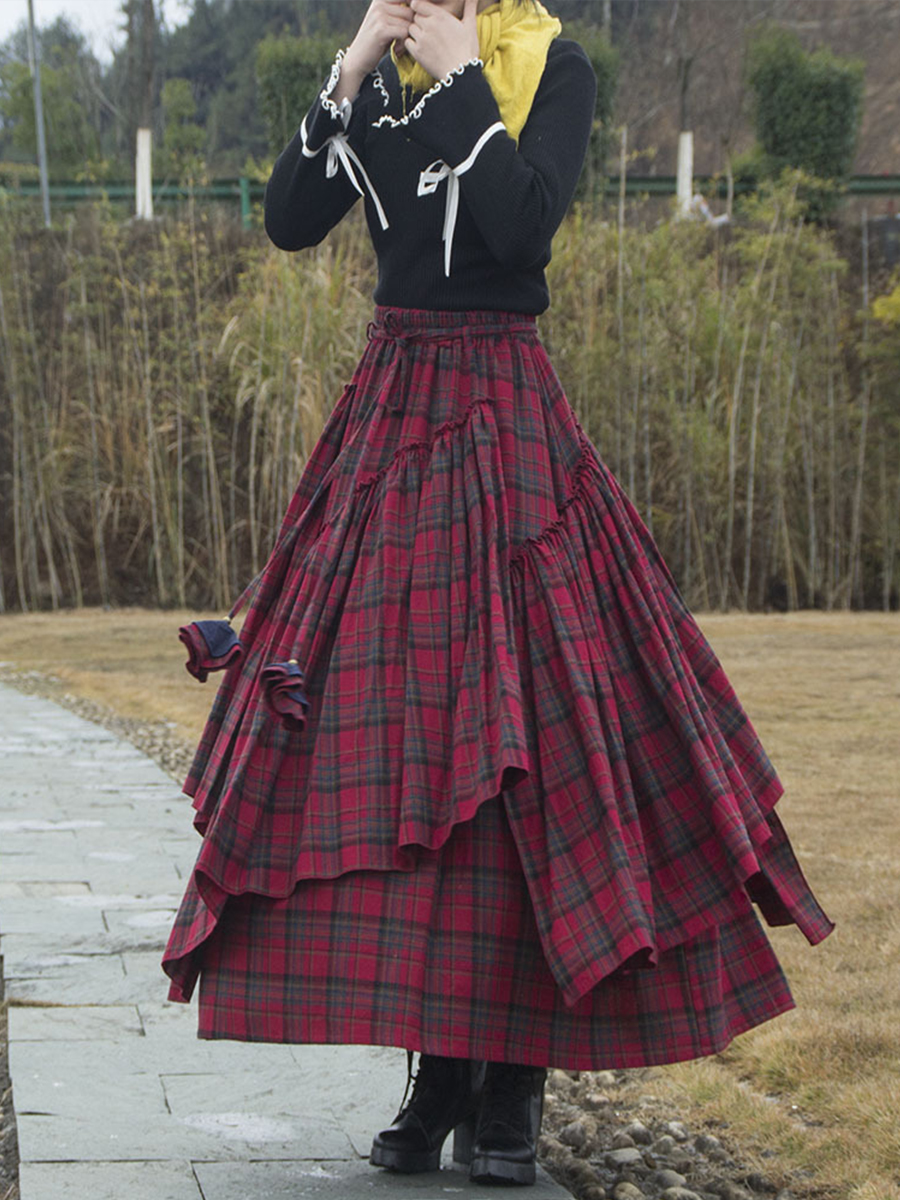 Kalenmos Literary Retro Check Children's Women Skirts Irregular Hem Lace High Waist Heavy Cotton Brushed Pleated Medieval Skirt