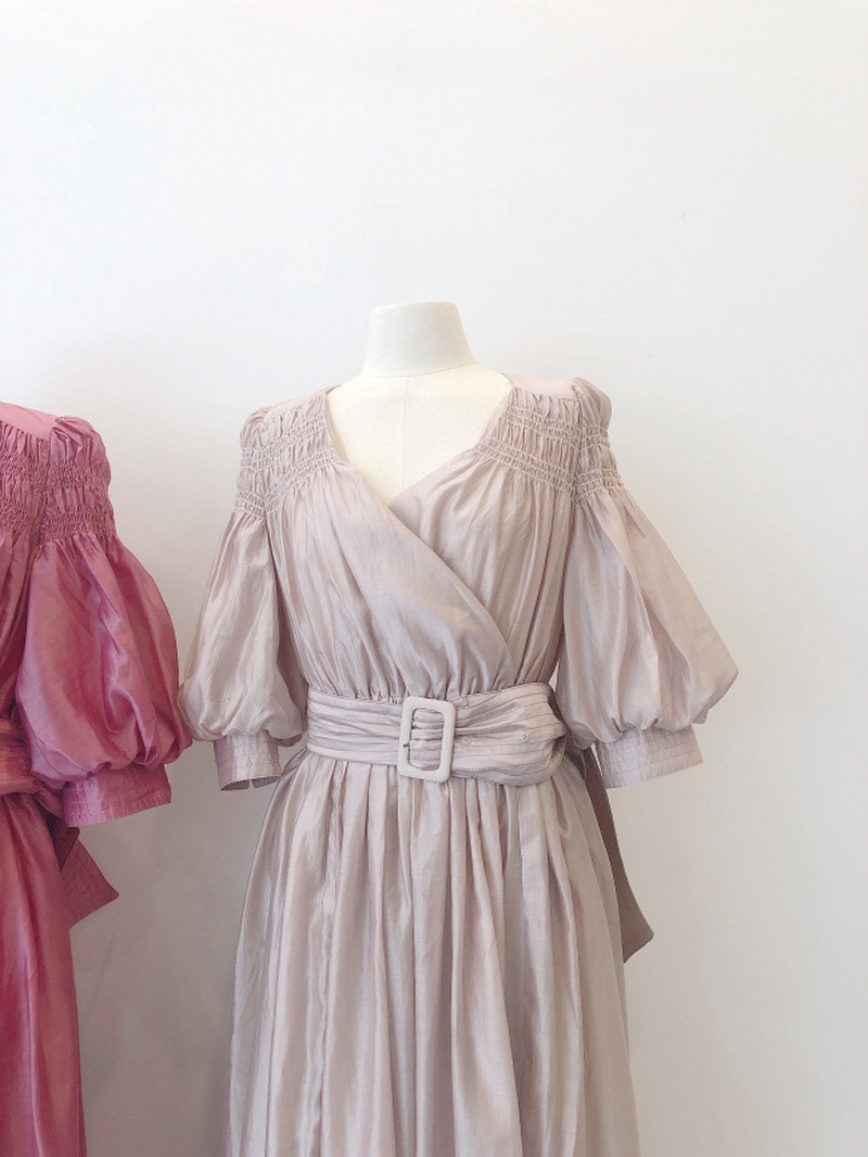 Kuzuwata V Neck Elastic Shoulder Lantern Sleeve Femme Robe Summer Vestidos Cross Slim Waist Pleated Solid Dresses with Belt
