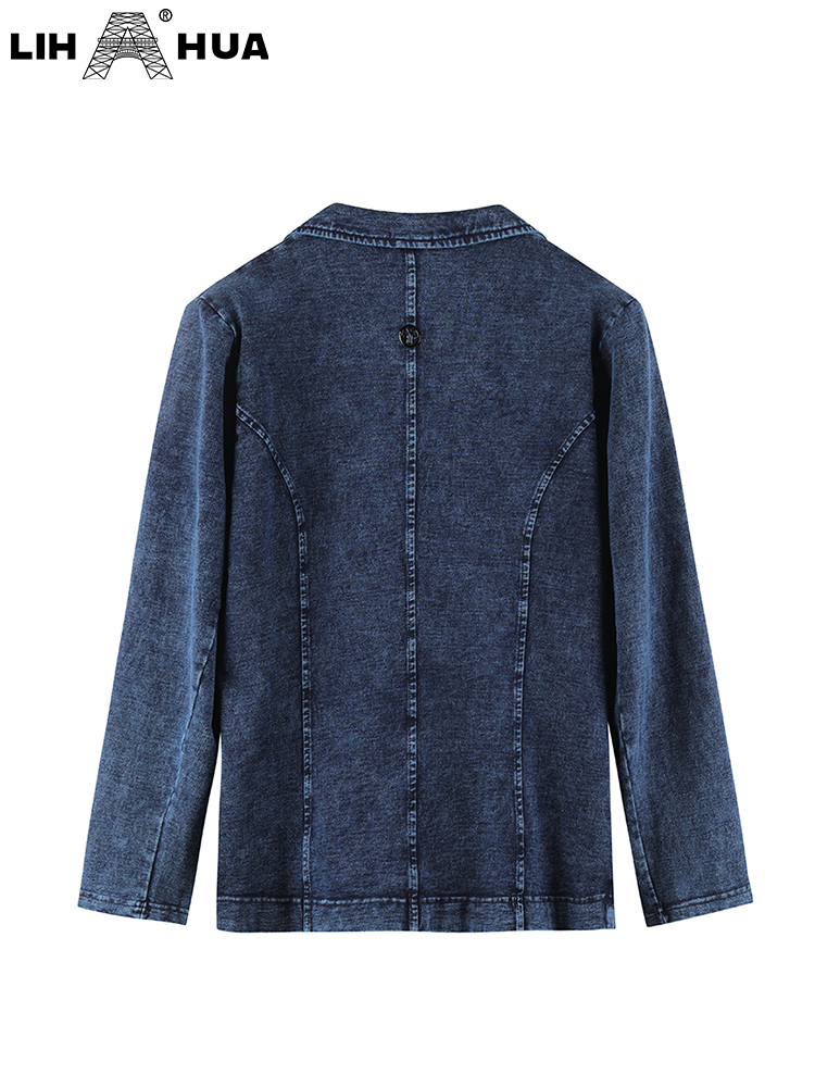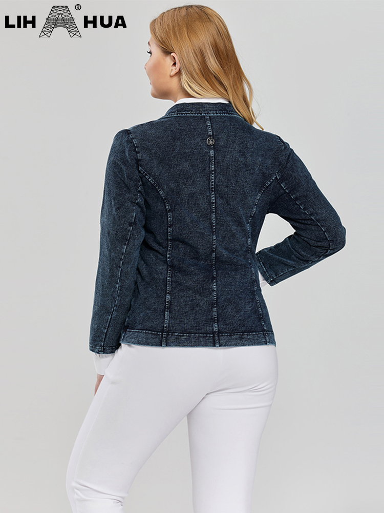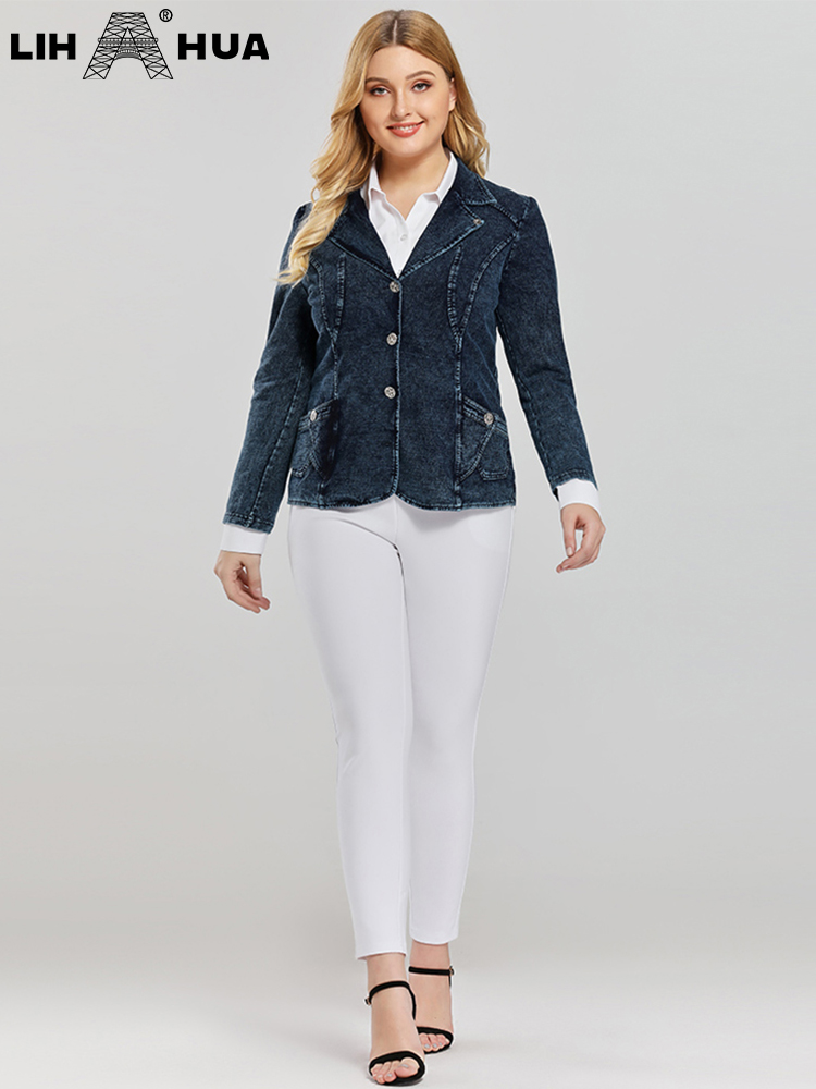 LIH HUA Women's Plus Size Denim Suit Fall Jacket Knit Stretch Long Sleeve Button Jacket