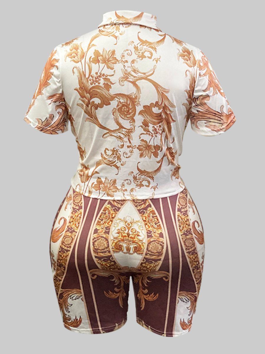 LW Plus Size Turndown Collar Baroque Print Shorts Set Sexy Two Pieces Hubble-bubble Sleeve Women Clothings Lady Outfits