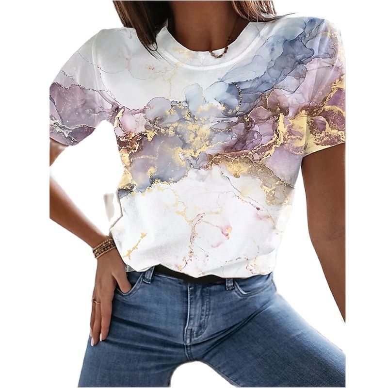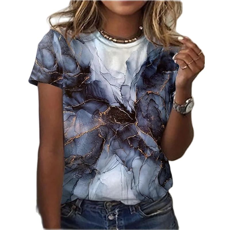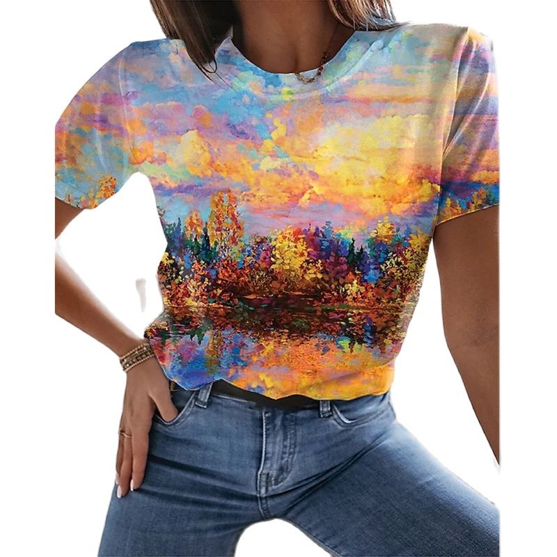 Ladies 3D printing painting T-shirt landscape 3D printing summer round neck big discount