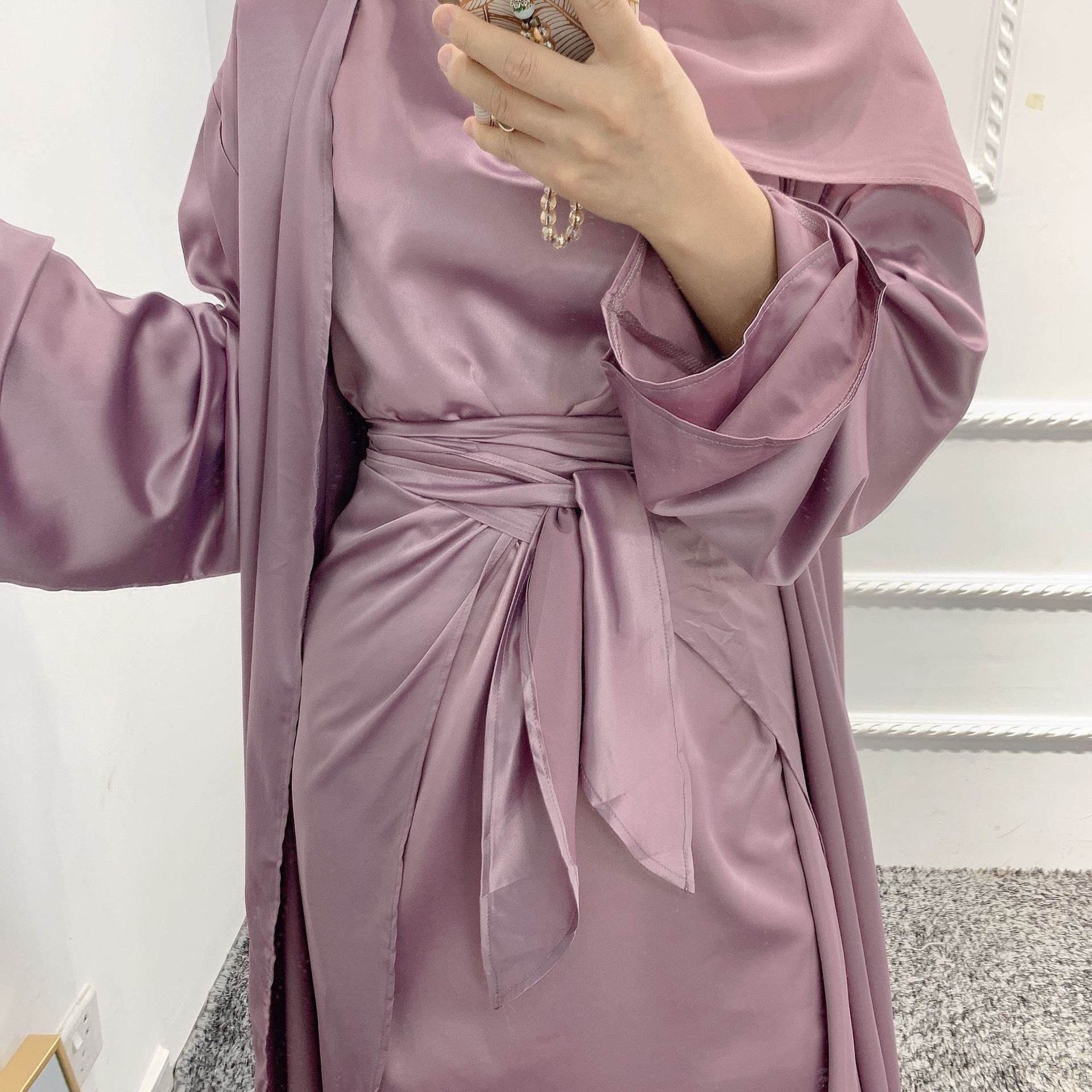 Muslim cardigan Kimono Women Hijab Dress Abaya Inner Robe with Wrap Tie Skirt Islam Clothing Dubai Turkey Kaftan Modest Outfit