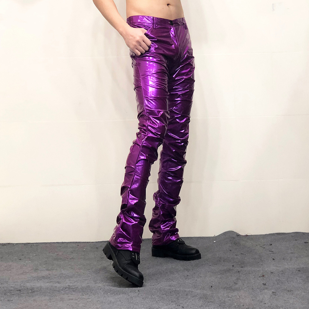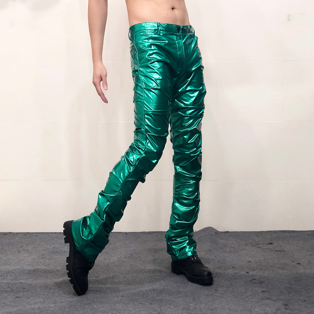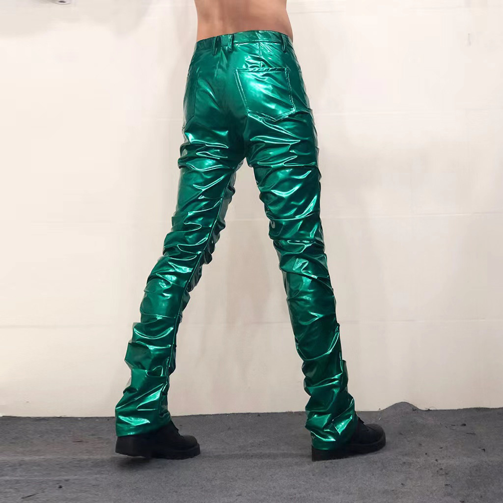 Nightclub Streetwear Shinny Sexy Leather Pant Men Costumes PU Flare Pant Erkek Pantolon Men Green Pant Pleated Trouser
