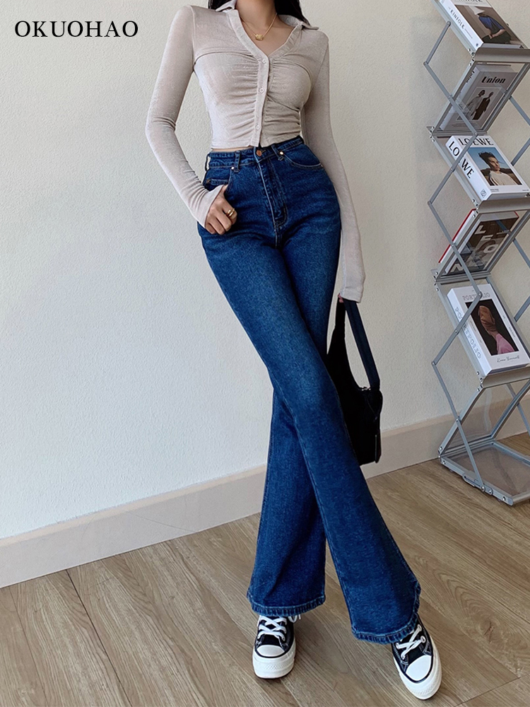 Okuohao Skinny Bell Bottom Jeans High Waist Stretch Straight Slim Fit Flared Denim Pants Casual Wash Black Y2k Trousers