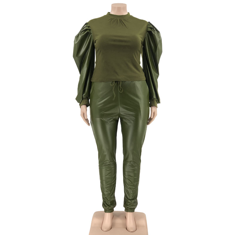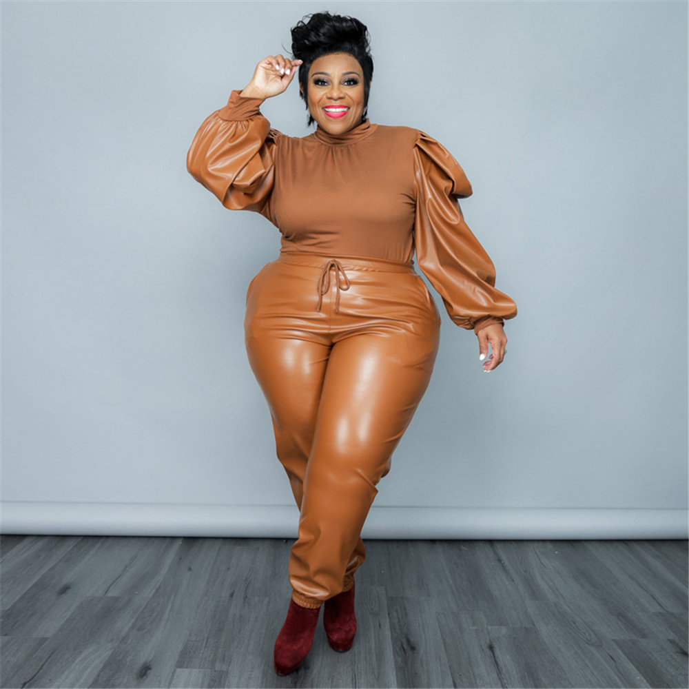 PU Women's Clothing Plus Size Sets Two Piece Outfits Puff Sleeve Patchwork Crop and Pants Streetwear WholeDropshipping