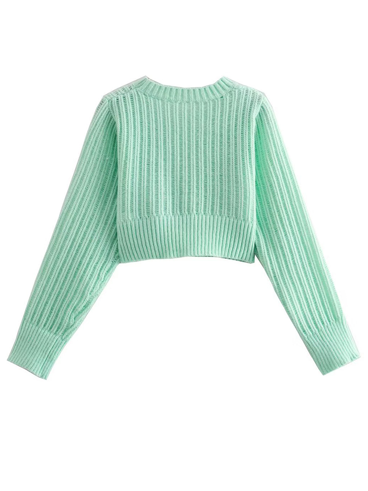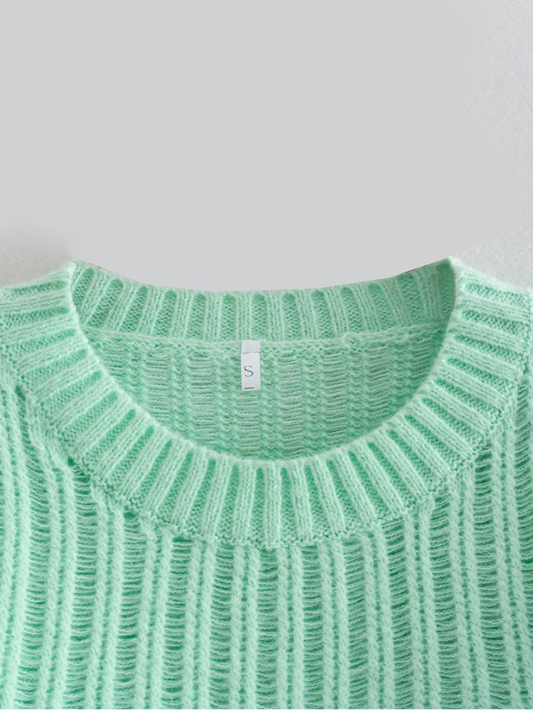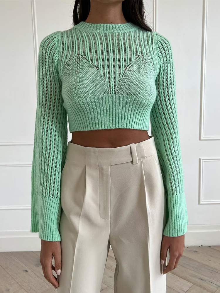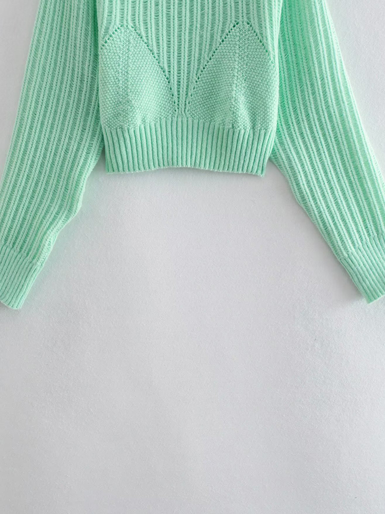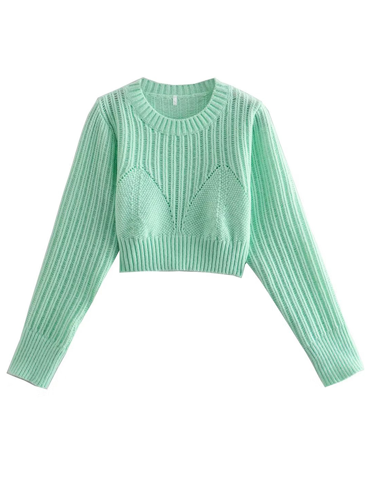 PUWD Women Green Cropped Open Knit Pullover Fall/Winter Ladies Sweater O-neck Vintage Solid Female Chic Crochet Knitwear