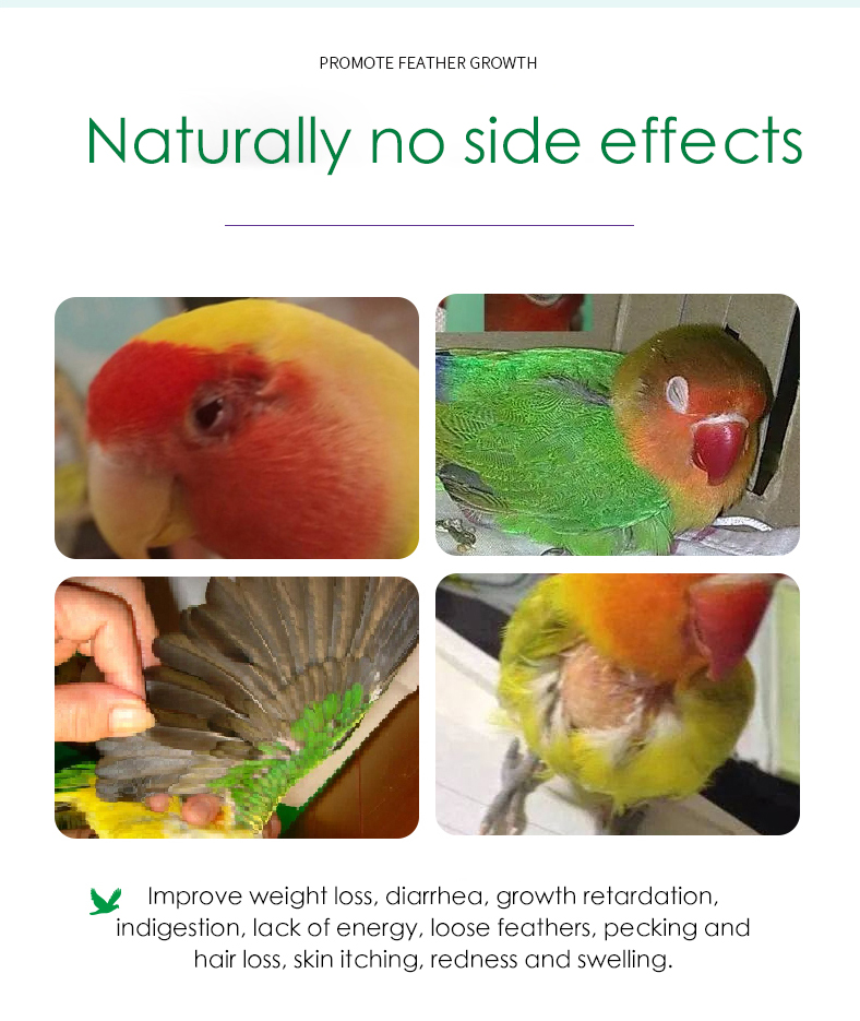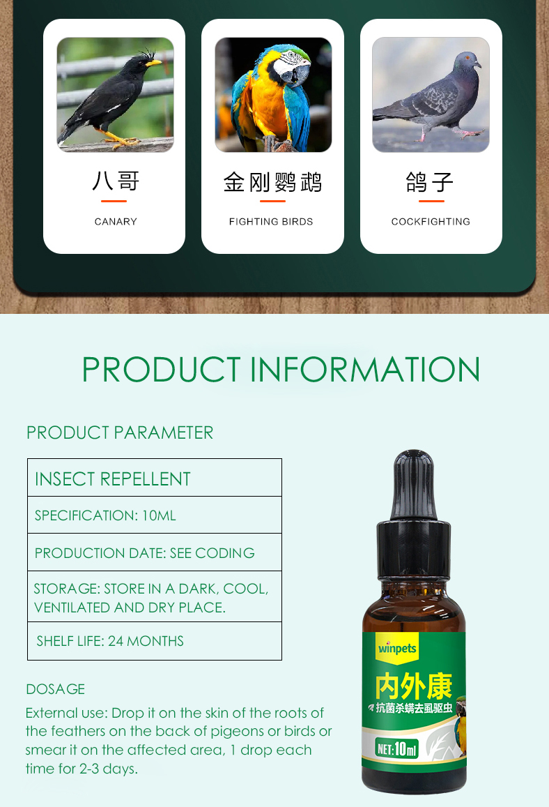 External use: Drop it on the skin of the roots of the feathers on the back of pigeons or birds or smear it on the affected area. Use 1 drop each time for 2-3 days.