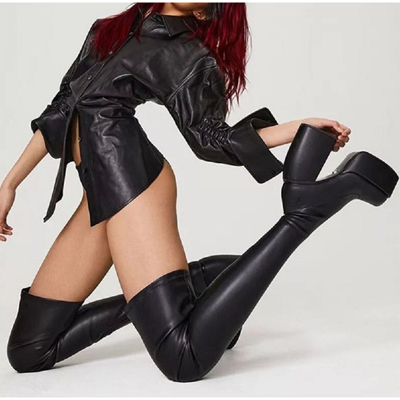 Platform Women Long Boots Feamle Square Toe Pu Leather Thick Bottom Shoes Soild Ladies Block High Heels Zipper Boot