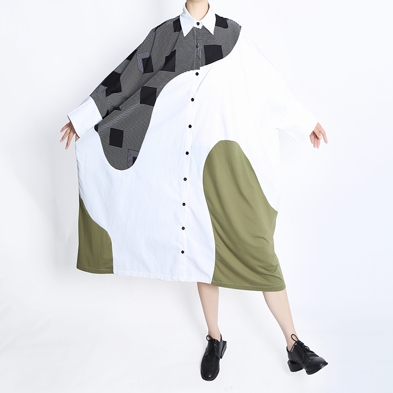 Plus Size New Autumn Woman Batwings Sleeve Loose Fit Patchwork Shirt Dress Printed Fashion Girls Unique