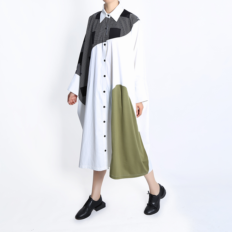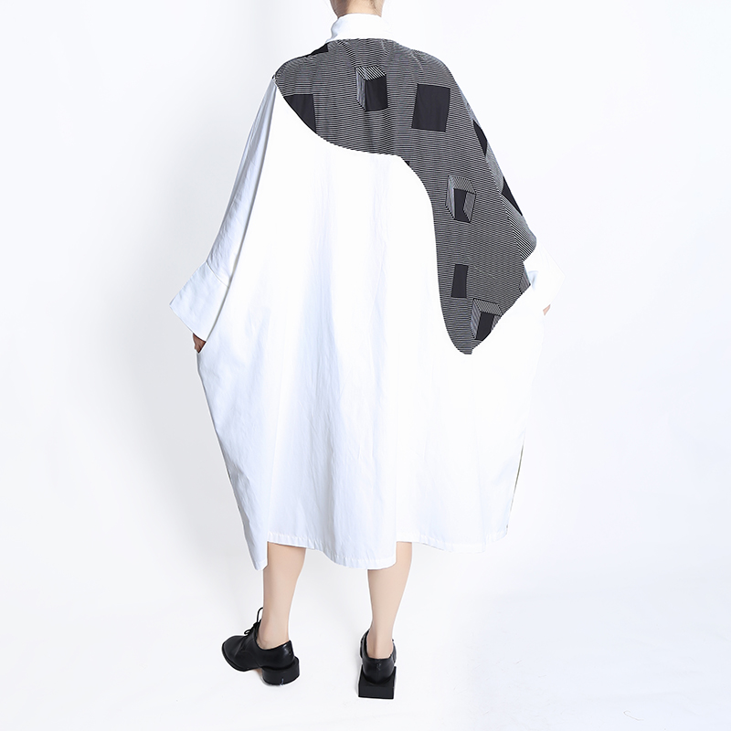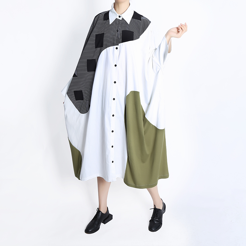 Plus Size Autumn Woman Batwings Sleeve Loose Fit Patchwork Shirt Dress Printed Girls Unique Streetwear Robe HU7712