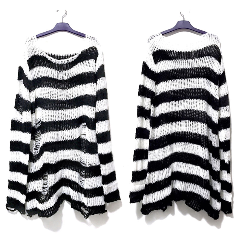 Punk Gothic Long Unisex Sweater Summer Women Striped Cool Hollow Out Hole Broken Jumper Loose Rock Thin Dark Streetwear Top