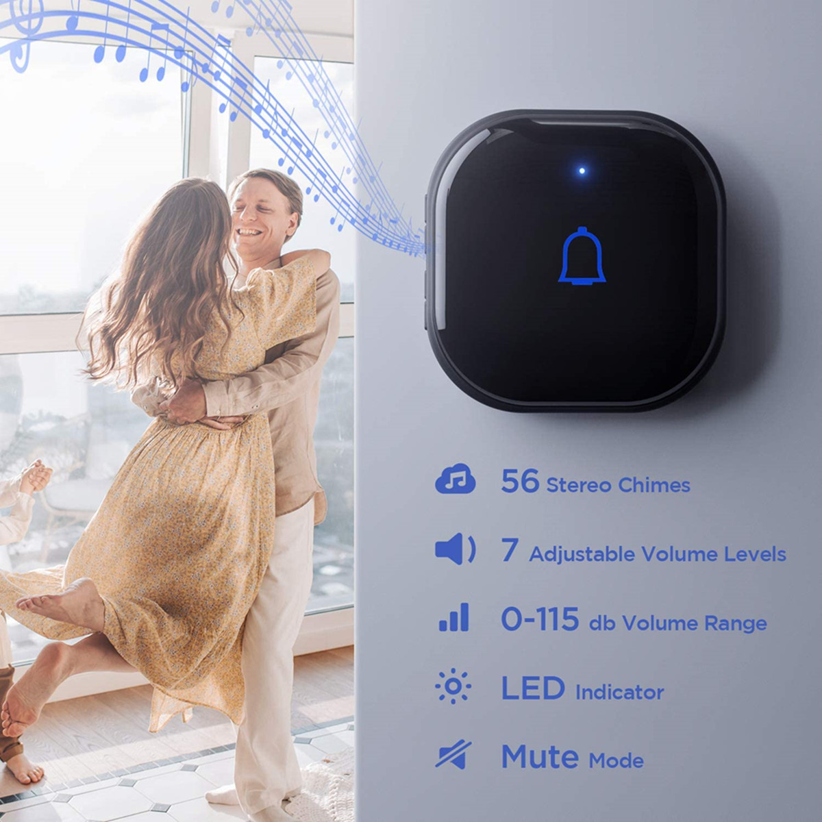 Doorbell chime features 56 chimes and 7 level adjustable volume that you can find your favorite music. In addition, The built-in stereo speakers can provide up to 115 decibels of clear and balanced sound which is loud and clear enough to be heard anywhere you are.