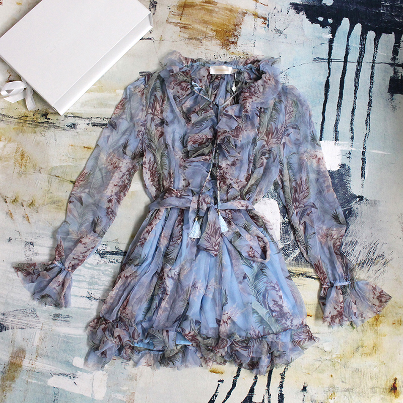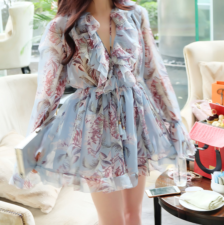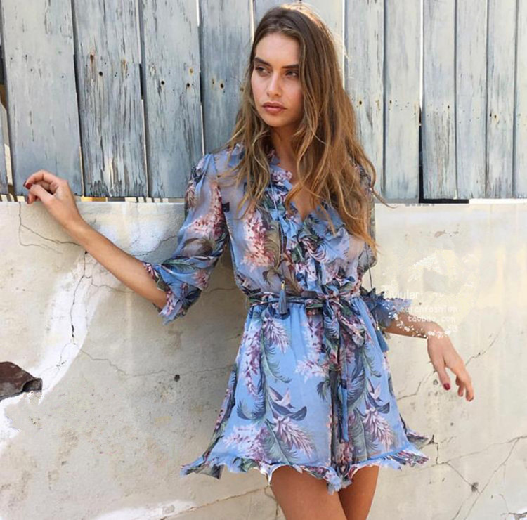 Runway Summer Women Rompers Blue Print Floral Long Sleeve Chiffon Sexy V Neck Female Outfits Sashes Beach Jumpusits
