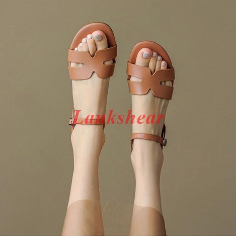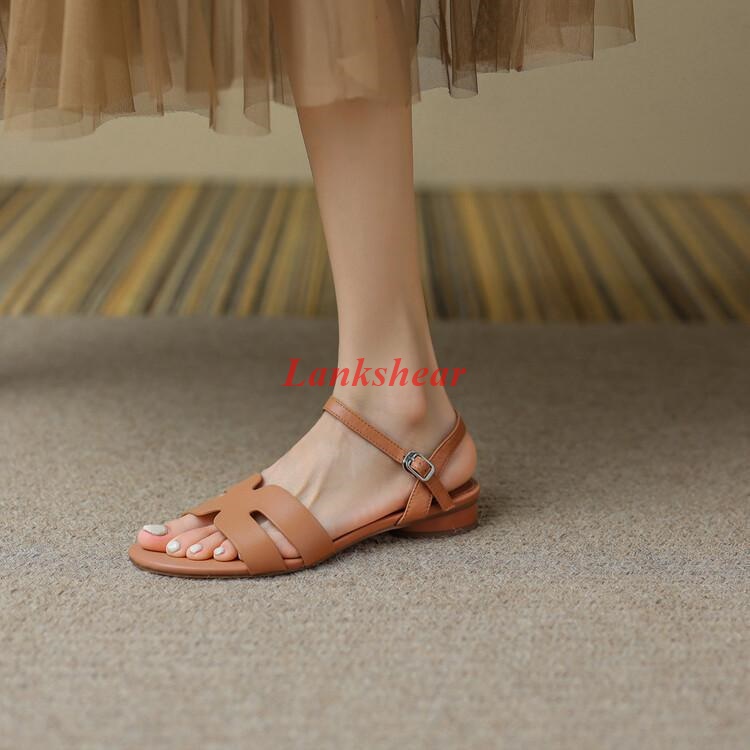 Summer Sandals Solid Color Cowhide Leather Hollow Low Heel Open Toe Strap Comfortable Ladies Sandals
