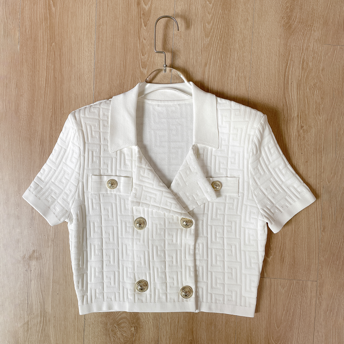 Summer White Geimetric Pattern Short Sleelve Notched Knittied Strechy Casual Slim Blouse Women Tops