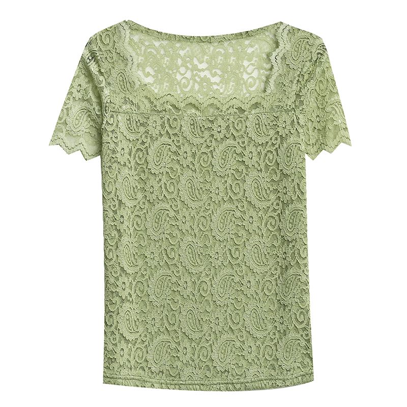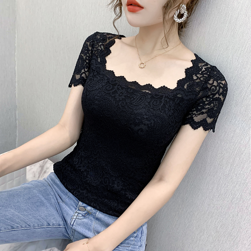 Summer short sleeve lace shirt Square collar women tshirt Solid color summer tops blusas Women lace tops