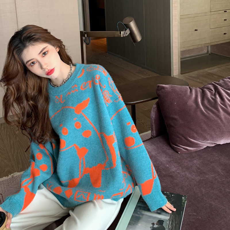 Sweater Cartoon Pattern Loose Autumn and Winter Pullover Version Round Neck Long Sleeve Knitted Top All-match Women
