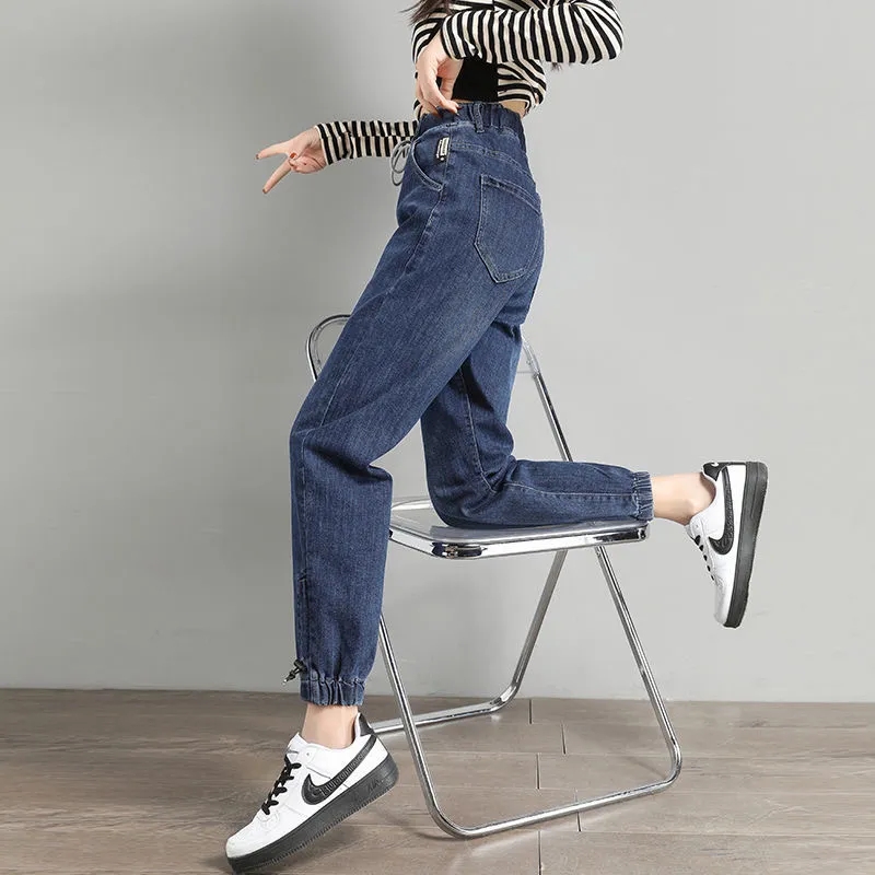 Trend Elastic High Waist Women's Jeans Bf Style Casual Banded Harem Vaqueros Mujer Ankle Length Blue/Black Denim Pants
