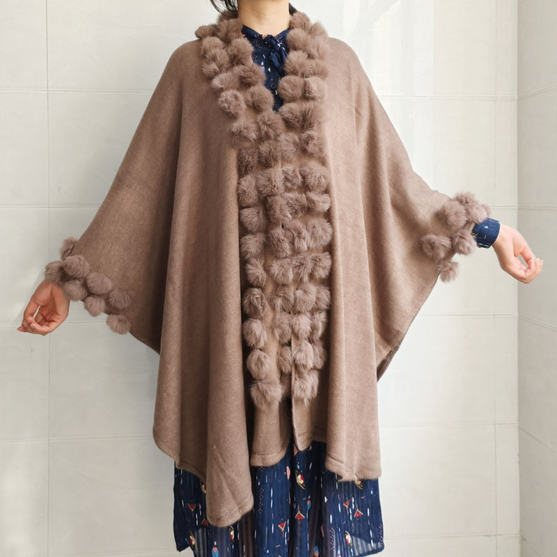 Women Rabbit Fur Poncho Shawl Coat Long