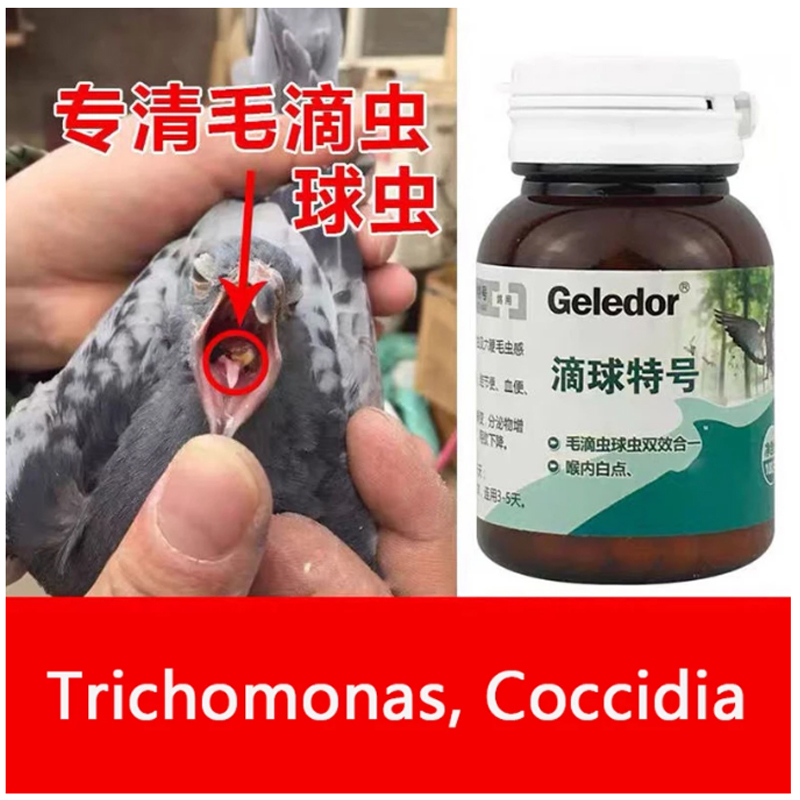 It is effective for trichomonas pigeons, coccidia, feather loosening, digestive disorders, coccidia infection, nodular stool, diarrhea and weight loss
