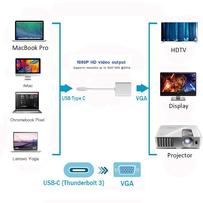 USB C To VGA Adapter:This USB C to VGA Adapter enables you to connect a USB C computer or phone to an VGA-equipped display,monitor,HDTV,projector.It's design for office, conference, home-theater entertainment .