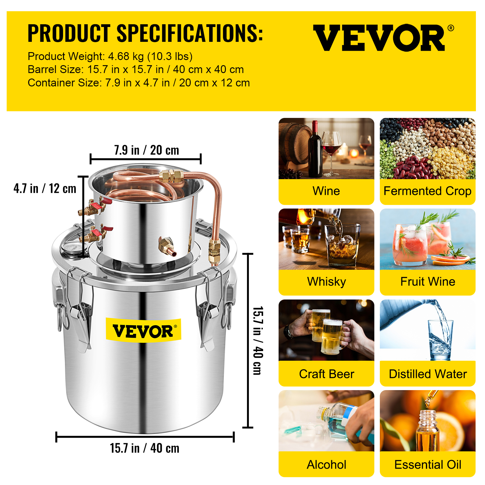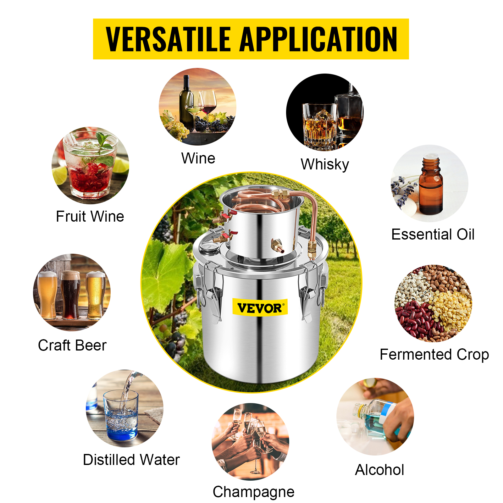 A full set of alcohol distiller, suitable for beginners and experts, with excellent cooling performance. It can be used to distill fruit wine, water, brandy and essential oils, apply for various heating methods like gas stoves, firewood, and electric ceramic heaters.