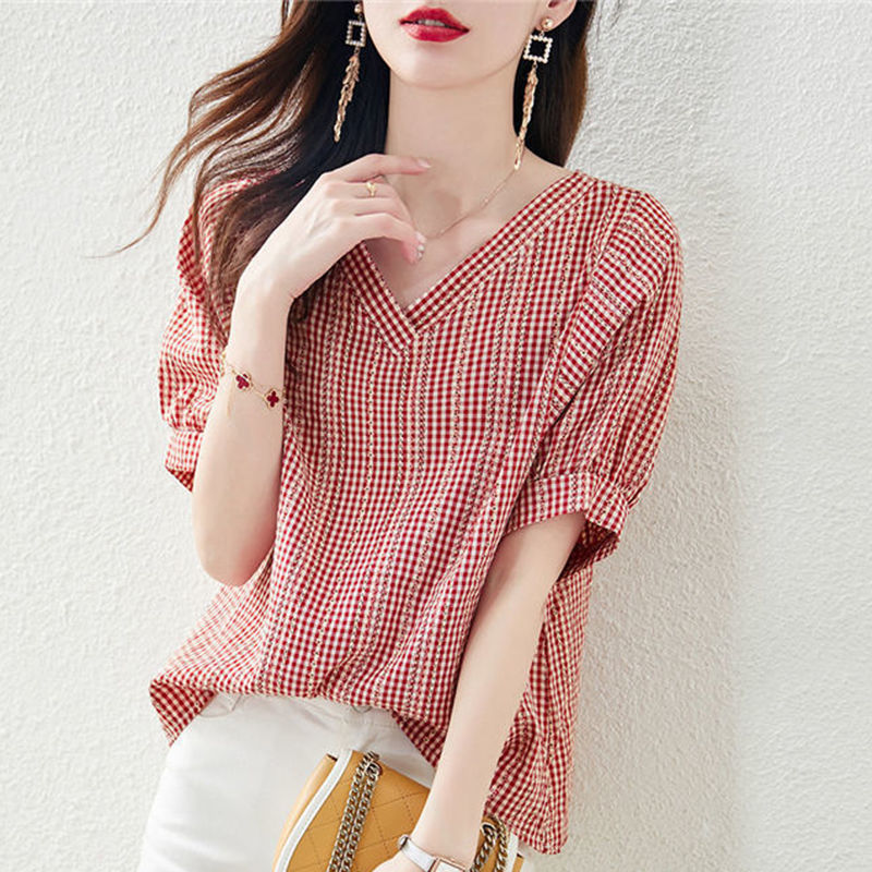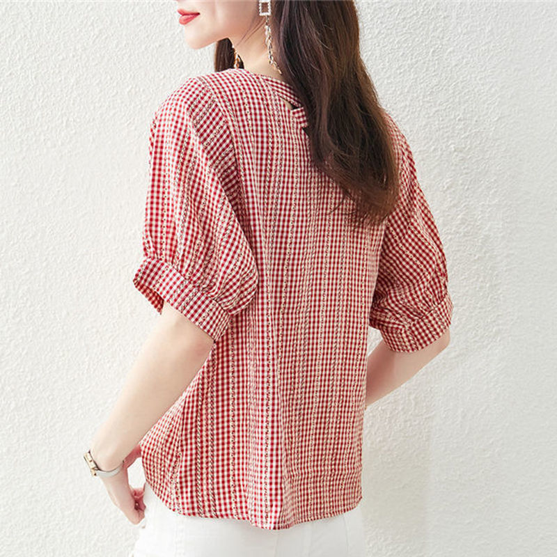 Vintage Printed Plaid V-Neck Oversized Puff Sleeve Shirt Summer Casual Pullovers Commute Women's Clothing Loose Blouse