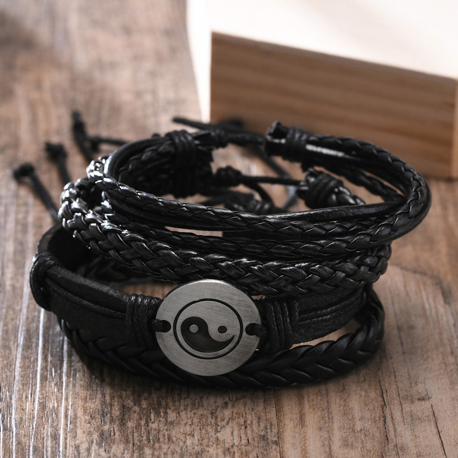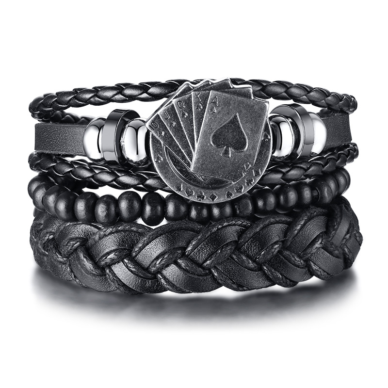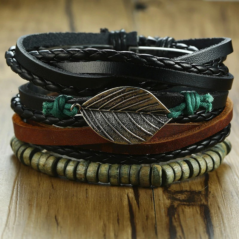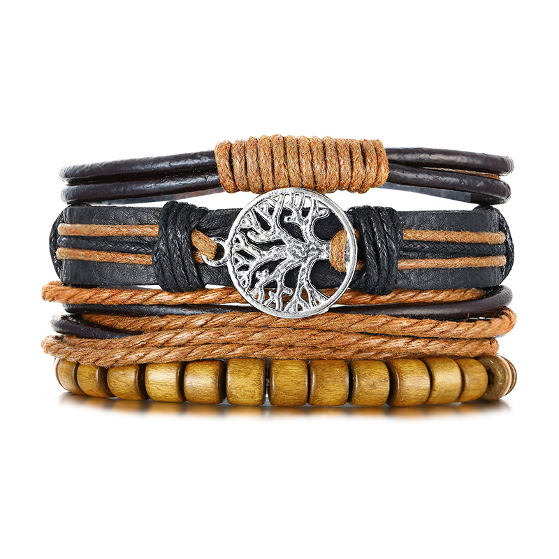 Vnox 4Pcs/ Set Braided Wrap Leather Bracelets for Men Vintage Life Tree Rudder Charm Wood Beads Ethnic Tribal Wristbands