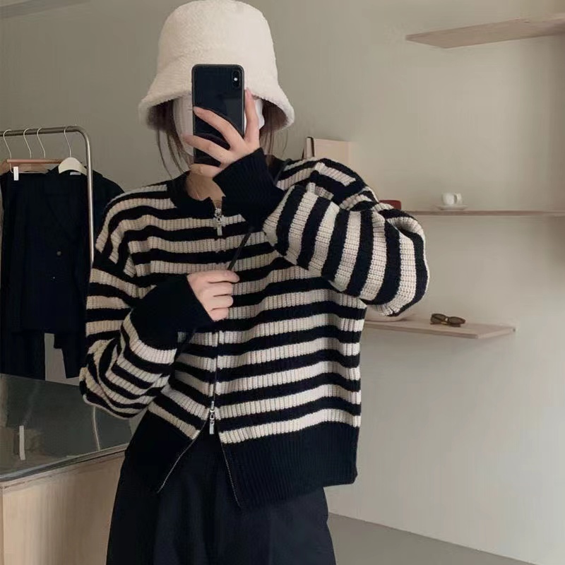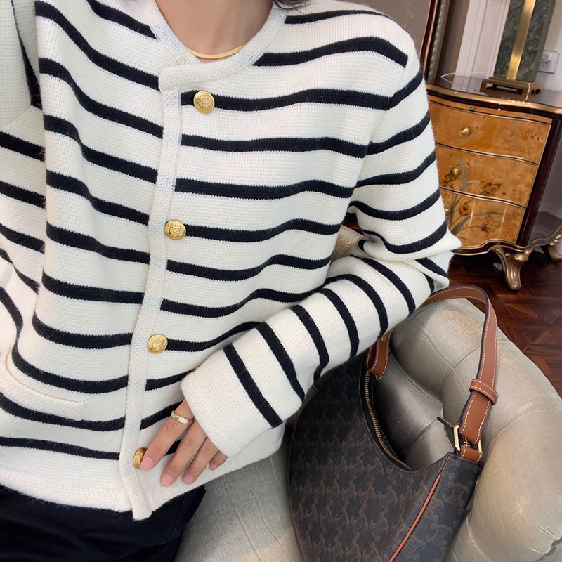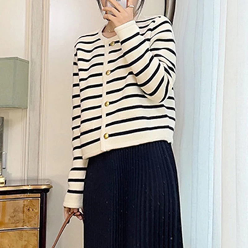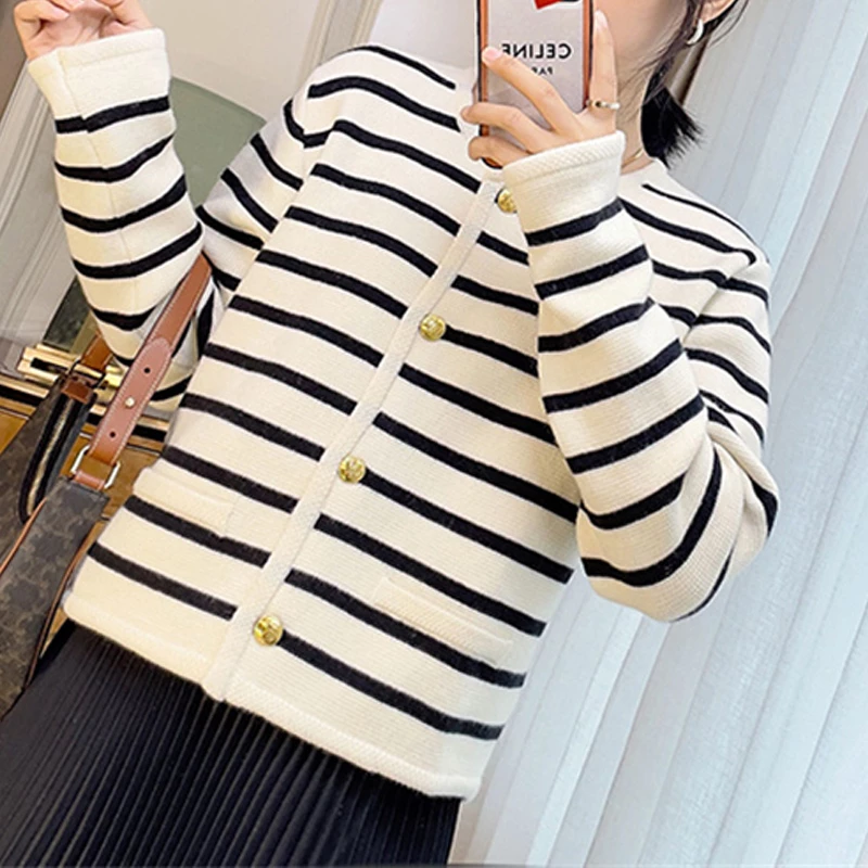 White Black Striped Short Cardigan Women Sweater Elegant Long Sleeve Top Spring cardigan women traf