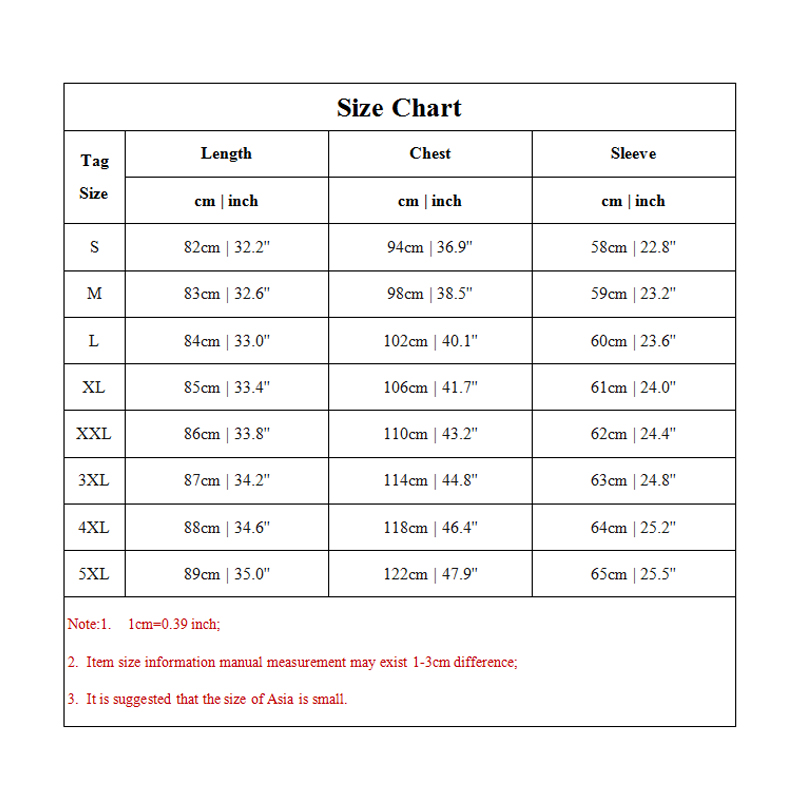 Note:1. 1cm=0.39 inch; 2. Item size information manual measurement may exist 1-3cm difference; 3. It is suggested that the size of Asia is small. | |||