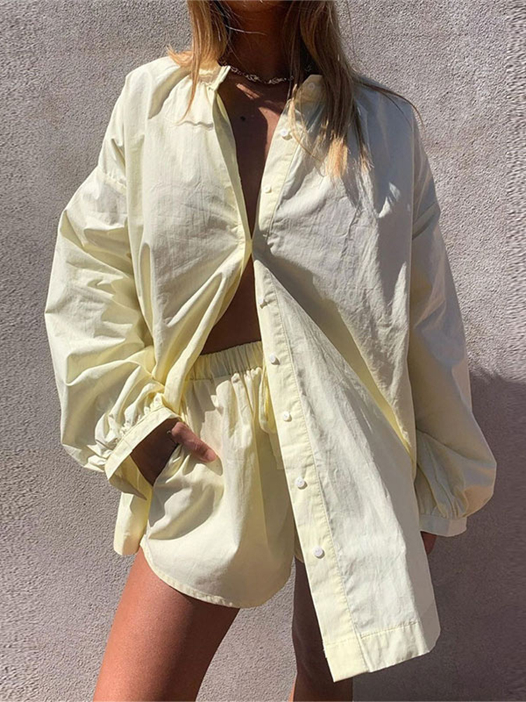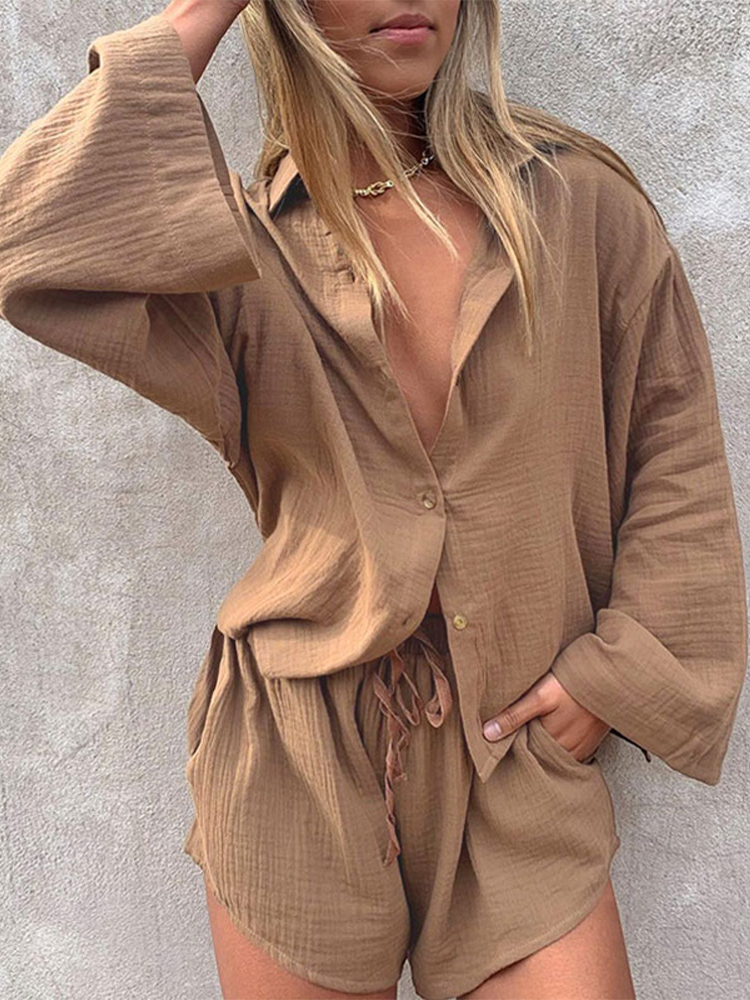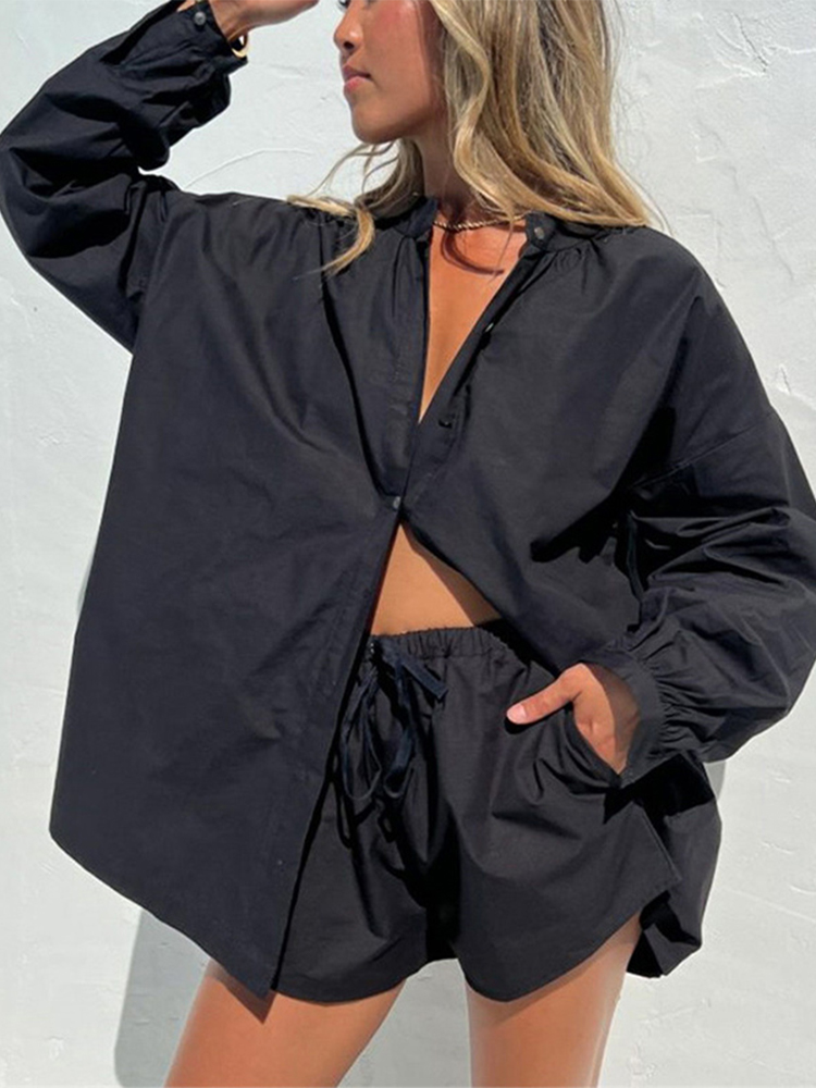 Women Casual Tracksuit Shorts Set Summer Long Sleeve Shirt Tops And Mini Drawstring Shorts Suit Lounge Wear Two Piece Set