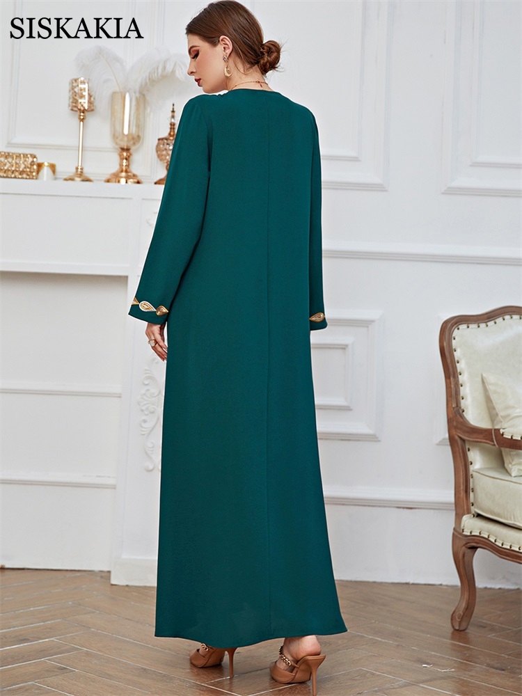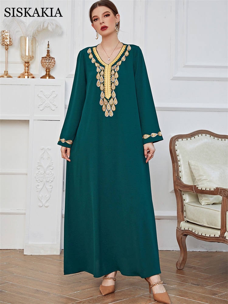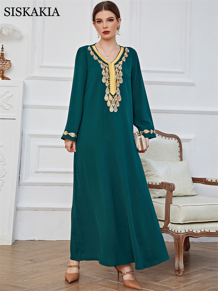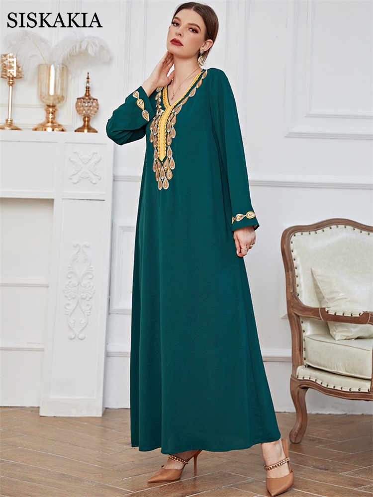 Women Dress Female Casual Spring Summer Embroidery Long Green Dress Loose Waist Dot Print National Style Retro Clothing
