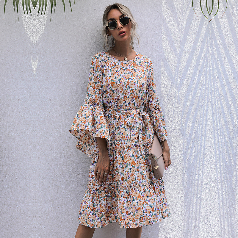 Women Elegant Cascade Ruffled Midi Dress Autumn O Neck Commute OL Shirt Dress Female Casual Holiday Dress Floral Dress