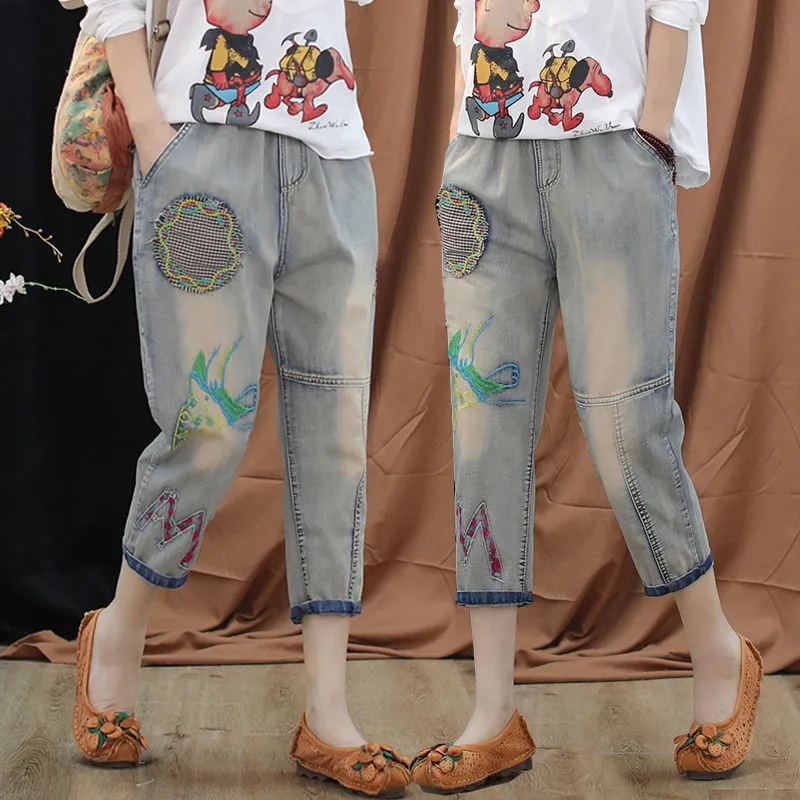 Women Jeans Summer High Waist Patch Denim Cropped Pants Female Elastic Waist Embroidered Color Matching Harem Pants A67