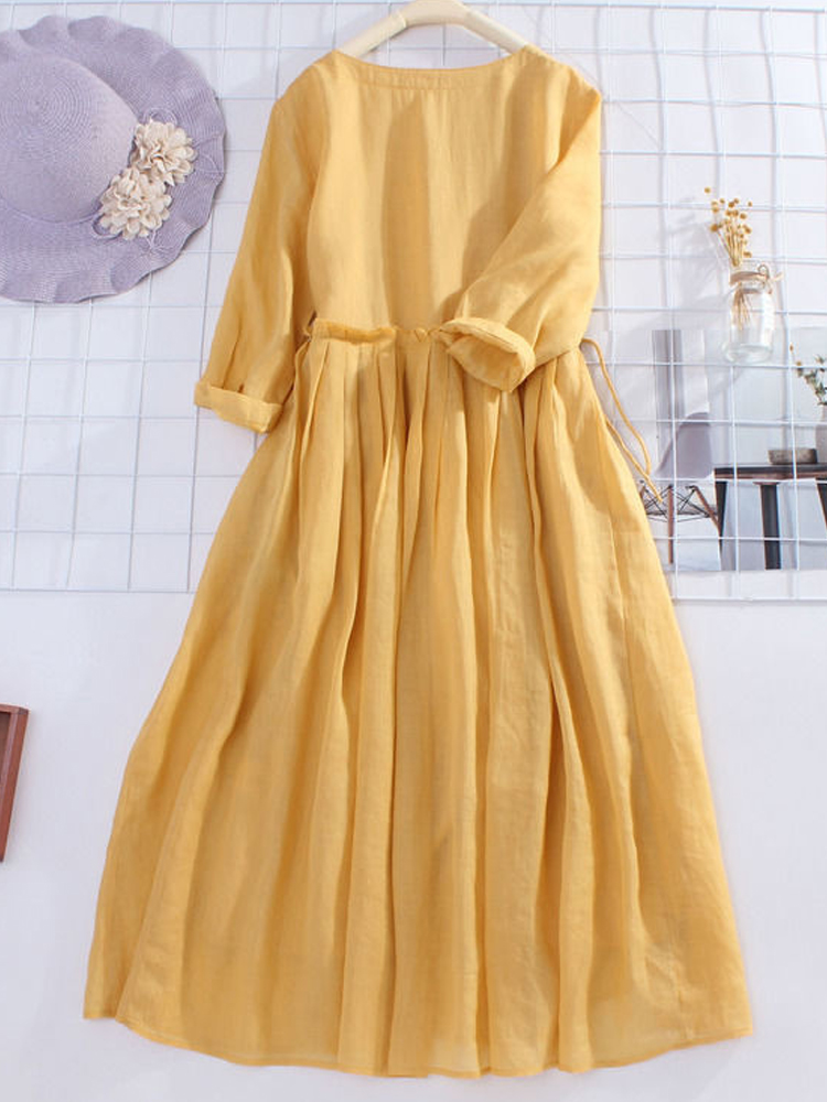 Women Summer Simple Style Cotton Linen Dresses Long Sleeve Drawstring Large Swing Solid Color Shirt Dress